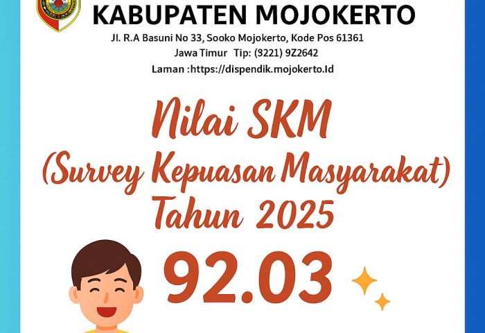✨ Nilai SKM Dinas Pendidikan Kabupaten Mojokerto Tahun 2025 ✨ Kami ucapkan terima kasih atas partisipasi masyarakat dalam Survey Kepuasan Masyarakat (SKM).Tahun 2025, Dinas Pendidikan Kabupaten Mojokerto memperoleh nilai 92,03 🎉 📊 Hasil ini mencerminkan kepercayaan dan kepuasan masyarakat terhadap pelayanan kami.Kami akan terus berkomitmen memberikan pelayanan pendidikan terbaik bagi masyarakat Kabupaten Mojokerto 💪📚 🙏 […]